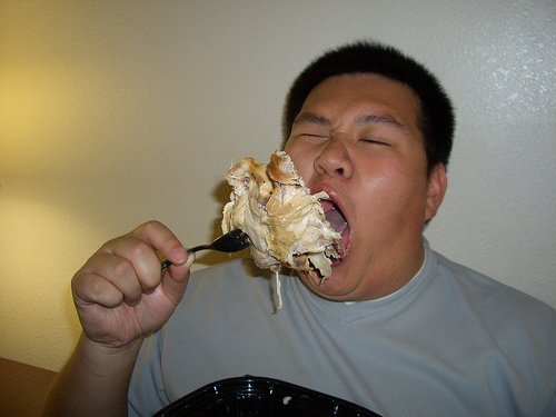 My good wife keeps an eye on my eating practice. She notes that I take 2 or 3 forkfuls at a time. I told her that I don't swallow the first forkful, I just accumulate enough of the food in my mouth so that I can enjoy the synergy of the different foods and expedite the process. I don't mind chewing to liquification, but I can do 2 or 3 forkfuls in one operation. I guess it all boils down to how big a mouth you have. Now the guy above is not me and what he is about to inject in his mouth does not represent one of my forkfuls.