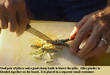 2. On a cutting board prepare your dry anti-oxidants by mashing the tablets or slicing open the caplets, your herbs etc. (Adding the tablets and pills in their whole form dissolve readily if you have a high powered blender) Put the mix right in the blender.