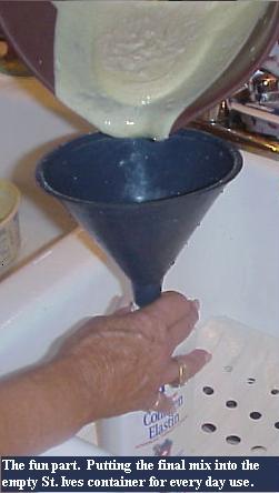 After you squeeze/pour most of the contents out of the new St. Ives containers into a mixing bowl, (You don't have to get every last drop of the straight cream left in the container as you are going to use the same containers for the finished mix.) You gently start to ladle in the Aloe Vera/Anti-oxidants that you just finished blending into the St. Ives cream in the mixing bowl. Stop when you have a nice creamy mix, not watery. You can add a little corn starch to a mix to tighten it up if necessary. Folks in the mid west that work in corn processing plants have found that the corn dust is actually a benefit to the skin, so a little corn starch that we eat in gravies etc. should not hurt you by adding it to the mix. If you use the gel from one aloe leaf for every container of St. Ives it will produce a nice creamy mix. If it is a little loose don't worry about it.