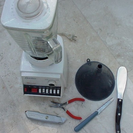 A blender, a couple of Pyrex jars, funnel, pliers as shown.