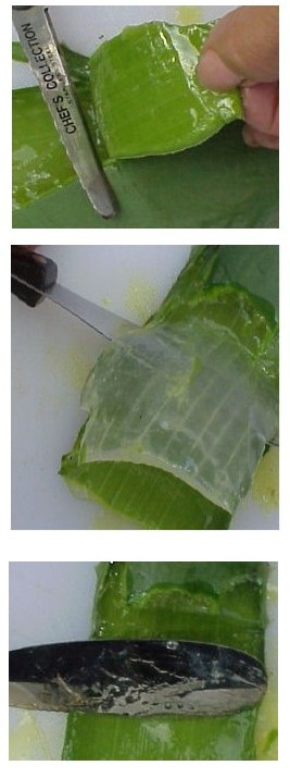 Good sharp paring knife to remove outside skin and a larger knife to slice the gel off of the leaves, followed by scraping the balance off on to the cutting board, using the same serrated knife on the far right of the illustration.