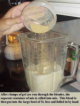After you squeeze/pour most of the contents out of the new St. Ives containers into a mixing bowl, (You don't have to get every last drop of the straight cream left in the container as you are going to use the same containers for the finished mix.) You gently start to ladle in the Aloe Vera/Anti-oxidants that you just finished blending into the St. Ives cream in the mixing bowl. Stop when you have a nice creamy mix, not watery. You can add a little corn starch to a mix to tighten it up if necessary. Folks in the mid west that work in corn processing plants have found that the corn dust is actually a benefit to the skin, so a little corn starch that we eat in gravies etc. should not hurt you by adding it to the mix. If you use the gel from one aloe leaf for every container of St. Ives it will produce a nice creamy mix. If it is a little loose don't worry about it.