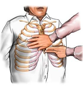 the heel of your hand in the middle of the chest. Cover it with your other